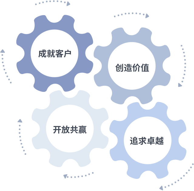 成就客户是一切决策的出发点,,创造价值是衡量所有工作的标准,,,,追求卓越是我们做事做人的态度,,开放共赢是我们的格局也是最终的结果。。。价值观的齿轮环环相扣,,推动着组织里的每个人不断向前。。。